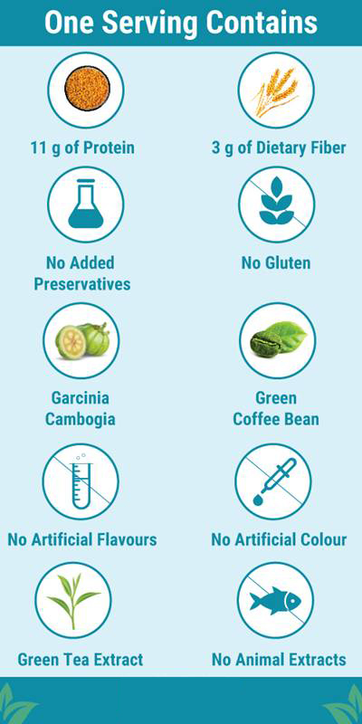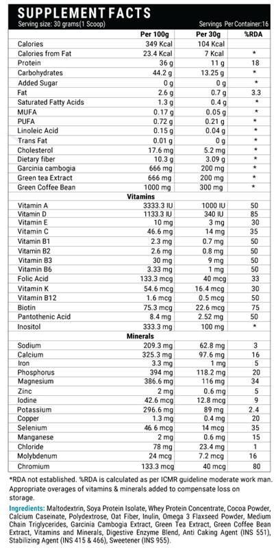 Maltodextrin, Soya Protein Isolate, Whey Protein Concentrate, Cocoa Powder, Calcium Caseinate, Polydextrose, Oat Fiber, Inulin, Omega 3 Flaxseed Powder, Medium Chain Triglycerides, Garcinia Cambogia Extract, Green Tea Extract, Green Coffee Bean Extract, Vitamins and Minerals, Digestive Enzyme Blend, Anti Caking Agent (INS 551), Stabilizing Agent (INS 415 & 466), Sweetener (INS 955).