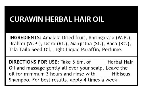 Suggested Usage: Take 5-6 ml of Curawin Herbal Oil and massage gently on your scalp and all over your hair. (Note: The quantity depends on the volume and length of hair). Leave the oil for a minimum time of 3 hours. Rinse it with Curawin Hibiscus Shampoo. For best results, apply 4 times a week.