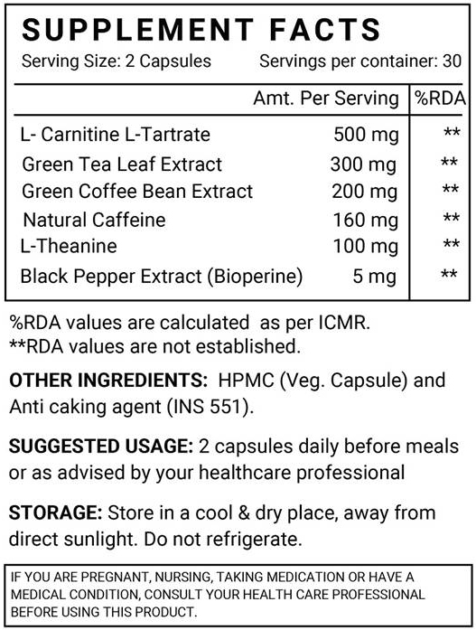 L-Carnitine L-Tartrate, Green Tea Extract, Green Coffee Bean Extract, Natural Caffeine, L-Theanine, Black Pepper Extract (Bioperine), HPMC (Veg. Capsules) and Anti-caking agent (INS 551).